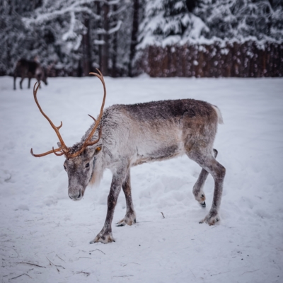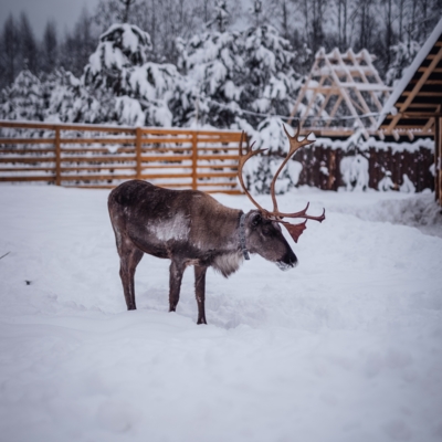 - Прогулка по ферме, где живут северные олени, далее вы покормите их с рук ягелем – любимым лакомством помощников Талвиукко.